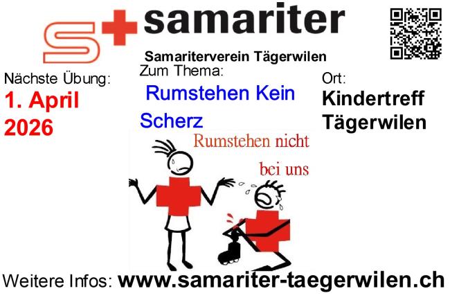 Die nächste Monatsübung des Samariterverein Tägerwilen und Kreuzlingen findet am 1. April 19:30Uhr in Tägerwilen statt.