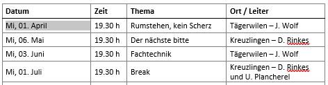Haben Sie Lust mal an einer Übung teilzunehme? Dann komm ganz einfach in eine Übung. Bitte melde Dich vorgängig und unverbindlich bei einem Vorstandsmitglied oder per E-Mail: